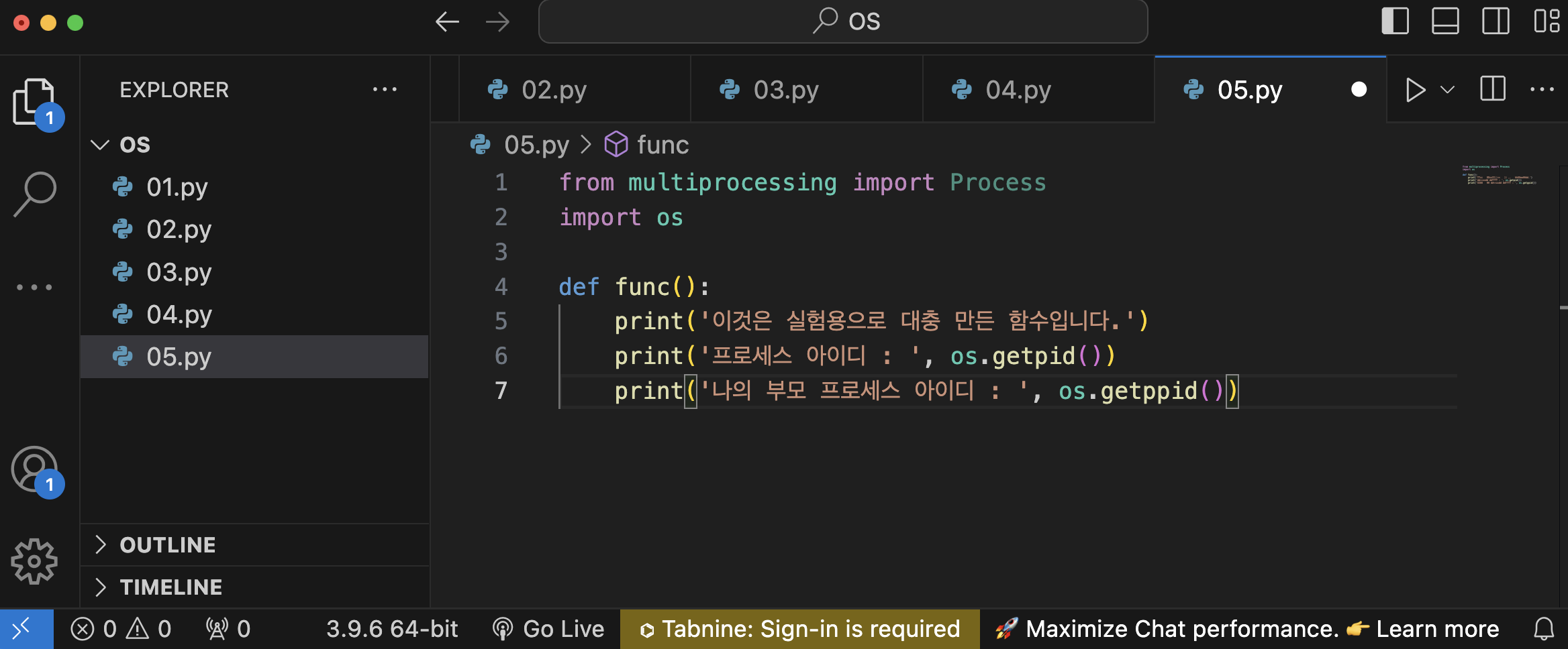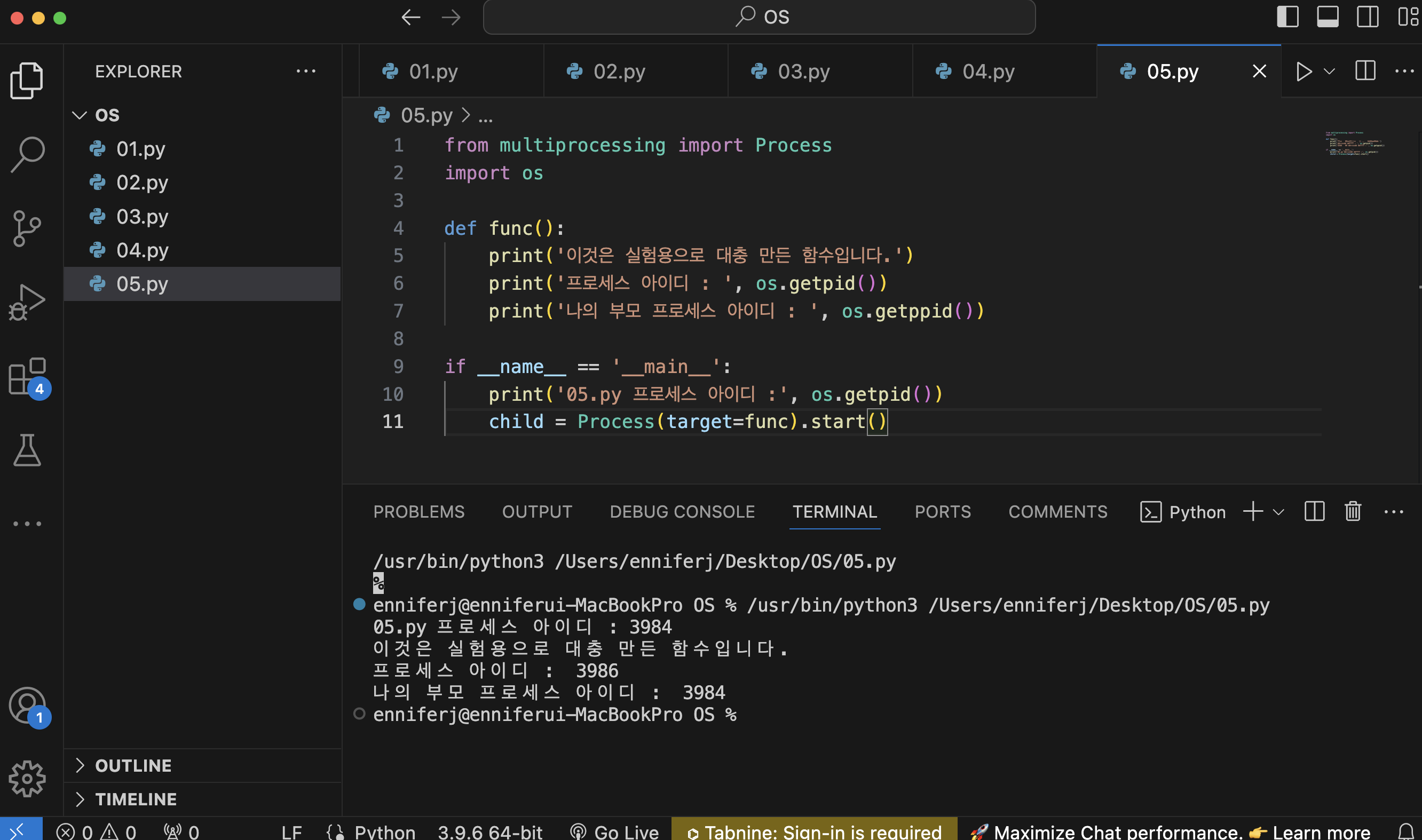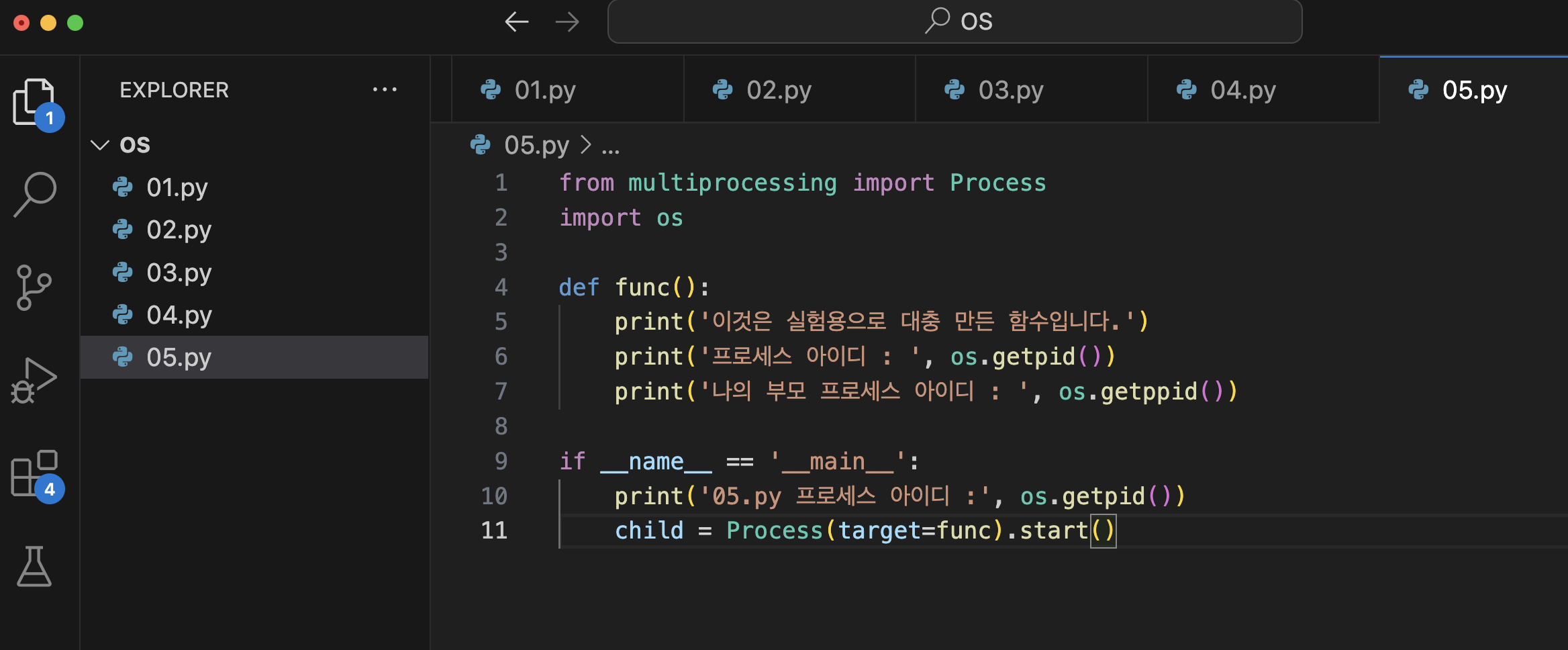 요약하면, 05.py 스크립트를 실행한 파이썬 프로세스가 부모 프로세스이고,